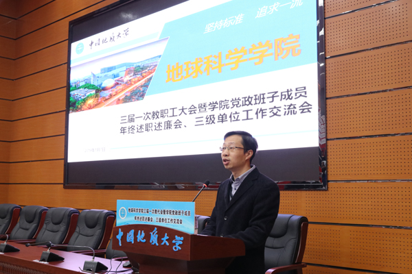 第一阶段教代会。章军锋院长代表学院作2018年工作报告、第二届分工会主席张宁作2018年学院分工会工作报告、办公室主任王德珲作2018年学院财经报告。大会通过举手表决的方式一致通过院长工作报告和第三届地学院分工会主席人选刘强,并对2018年获得各类荣誉的团体和个人进行了表彰。