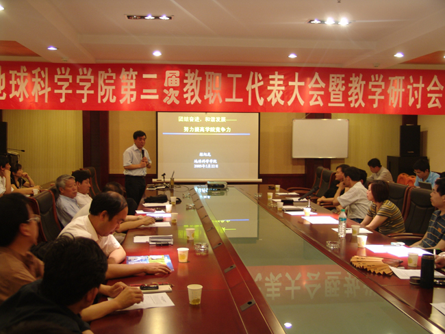 5月22日至23日,地学院第一届二次教职工代表大会暨教学研讨会隆重举行。作为学院学习实践科学发展观活动的重要内容,地学院党委高度重视。中科院院士金振民教授、副校长欧阳建平、校工会常务副主席高芸、教务处处长杨伦、科技处处长杜远生、国际合作处处长马昌前应邀参加大会,学院党政领导、教授、校院教代会代表共63人出席了本次大会。