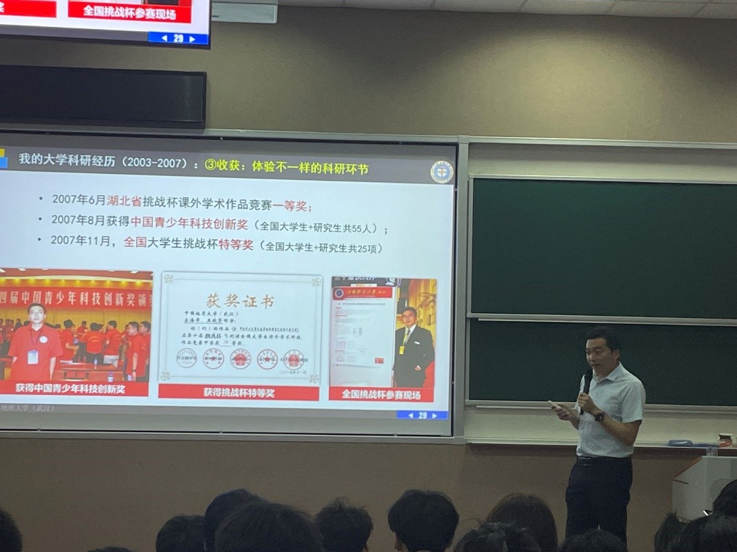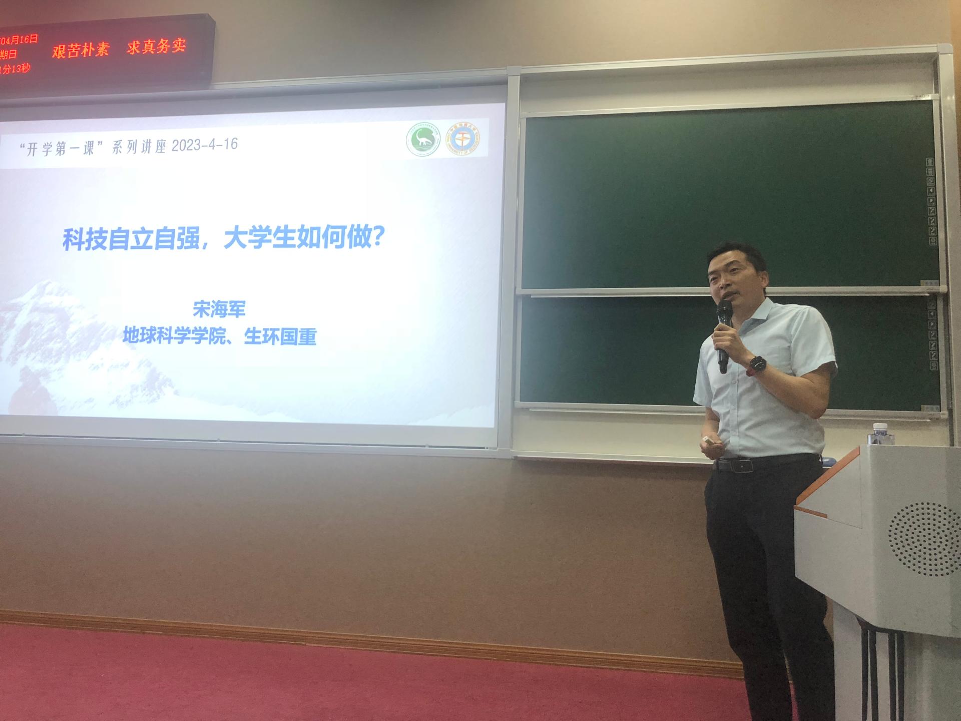 4月16日晚,第十七届“中国青年科技奖特别奖”获得者、欧美色情片 地球生物学系教授、生物地质与环境地质国家重点实验室副主任,“挑战杯”大学生课外学术科技竞赛优秀指导老师宋海军教授以“科技自立自强,大学生该如何做”为题,为欧美色情片 2022级本科生带来了一场精彩的主题报告。