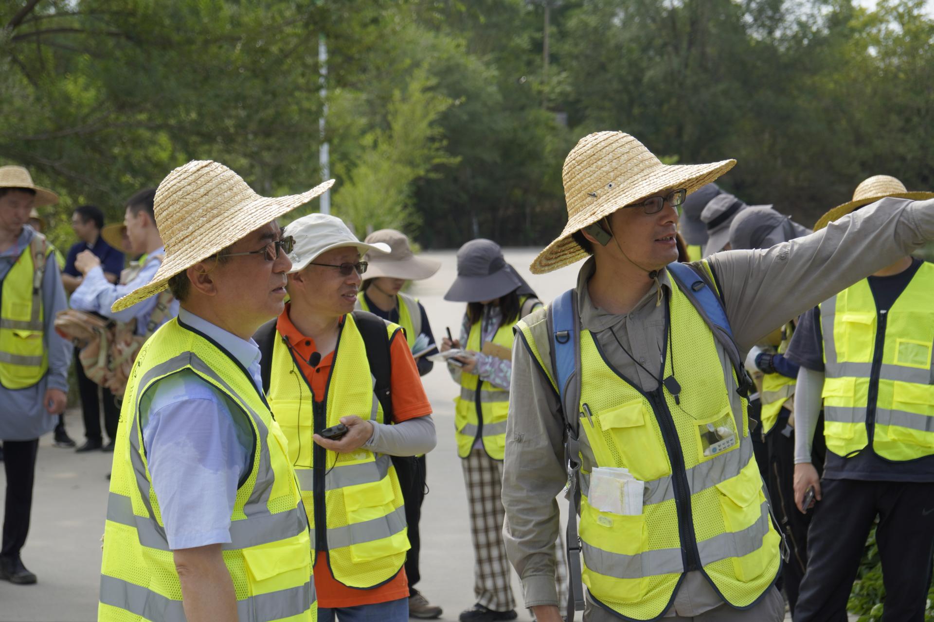 期间,王焰新一行随队参与野外实习。实习过程中,他与同学们一起听取老师授课,查看同学们的野外记录簿,并为同学们现场讲解坡积物与洪积物的野外地质现象。