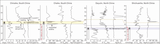 针对上述问题,本研究以华南和华北的代表性陆相二叠系-三叠系剖面为材料来源,开展了古生物学、沉积学、地球化学和地球系统模拟研究。系统的古生物学研究发现华南热带雨林植物被气候耐受性更强的种子蕨和石松植物所取代,伴随着植物的灭绝发生了频繁而高强度的野火事件。华北的松柏类植物也遭受了严重的危机,灭绝后植物化石记录十分有限。化学地层和高精度测年数据表明华北地区陆地生态危机的起始时间比华南地区早约30万年。