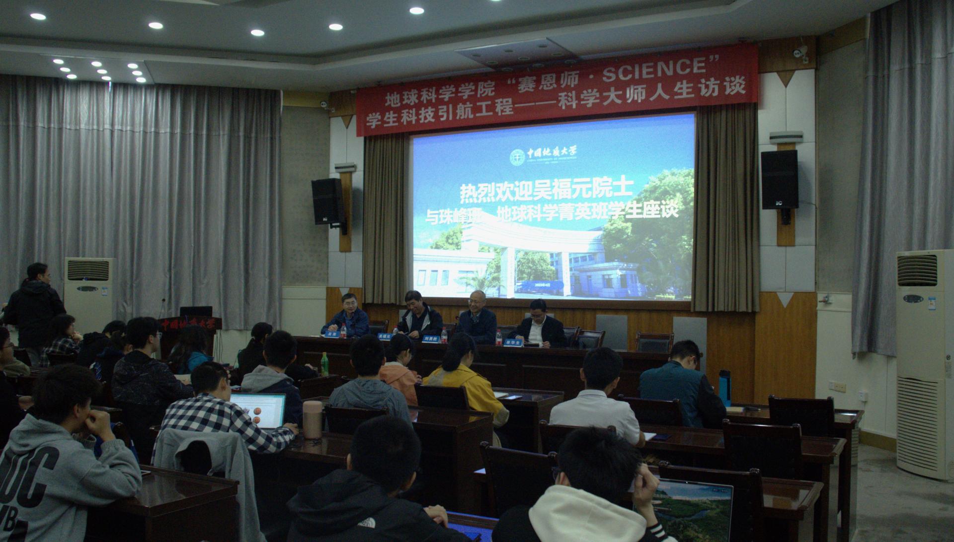 4月22日,在第54个世界地球日来临之际,中国科学院地质与地球物理研究所吴福元院士做客欧美色情片 “赛恩师·SCIENCE”科学大师人生访谈,与珠峰班、地球科学菁英班学子座谈。副校长刘勇胜主持座谈,欧美色情片 党委书记周刚、李四光学院常务副院长单华生参加座谈。