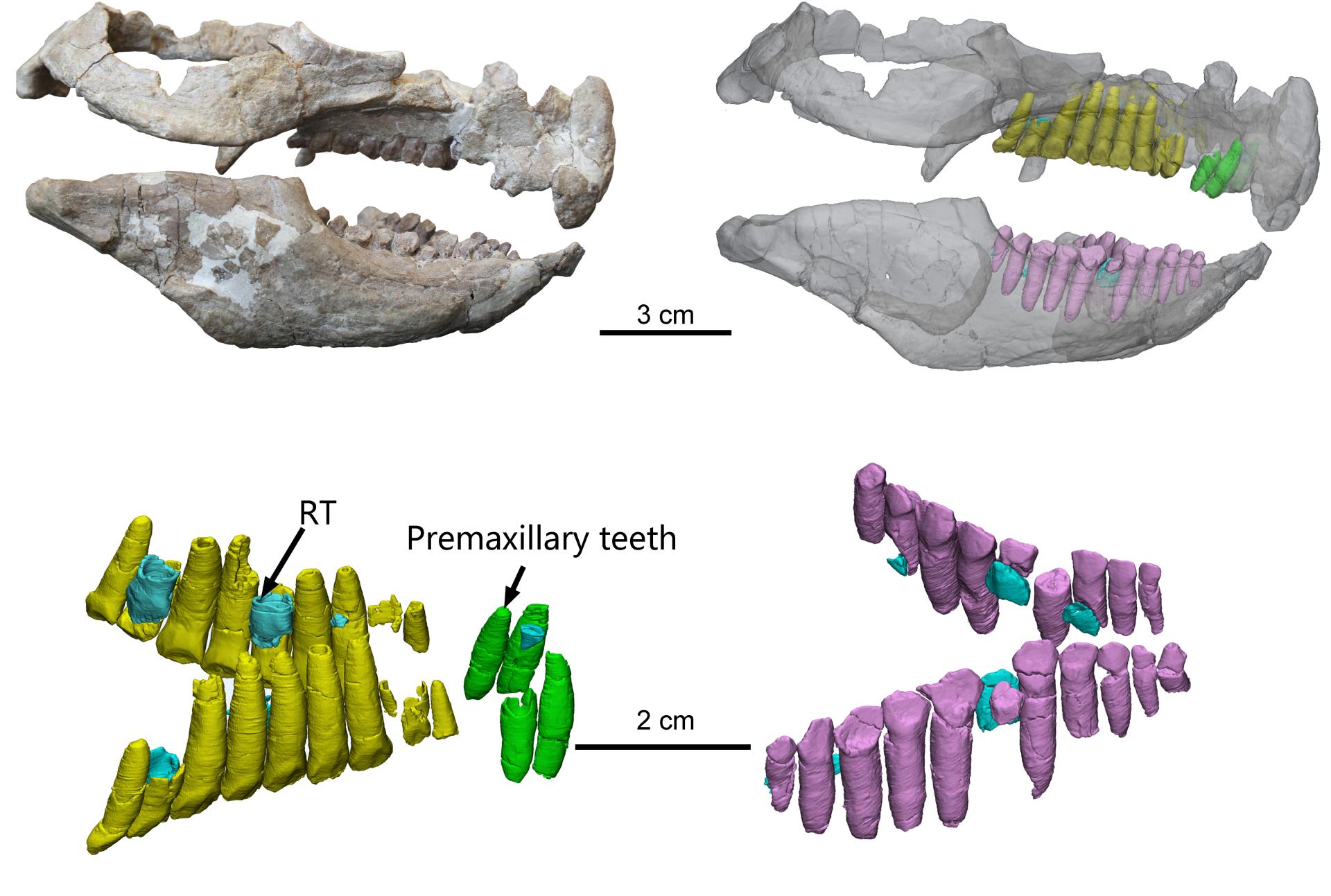 Figure 3. Photograph (upper left) and transparent reconstructions (upper right) of the skull of Chaoyangsaurus. 3D models of the upper jaw (lower left) and lower jaw (lower right) dentitions.