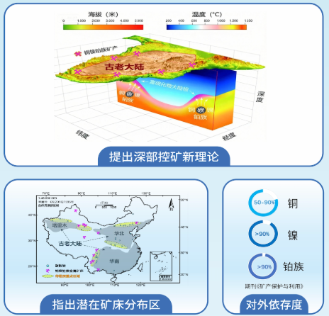 该研究成果首次揭示地下160-190公里存在富含铜镍铂族元素的硫化物富集层,建立碳酸岩及硫化物矿床的空间耦合关系和成因联系,发现古老大陆边缘的富碳酸岩区域是关键金属(铜、镍、铂族)矿产富集地,为我国深地找矿提供原创性理论支撑,成果发表于《自然》。